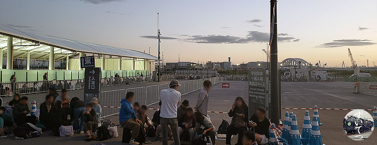 琵琶湖線始発で夢洲に到着出来るのは6:40。9/5に並ぶことが出来たのはこの位置だった。9/15の時は手前側(カメラでは見えていない右奥の角)まで達してたらしいが、まだ何とか最前列組には入ることが出来ている。