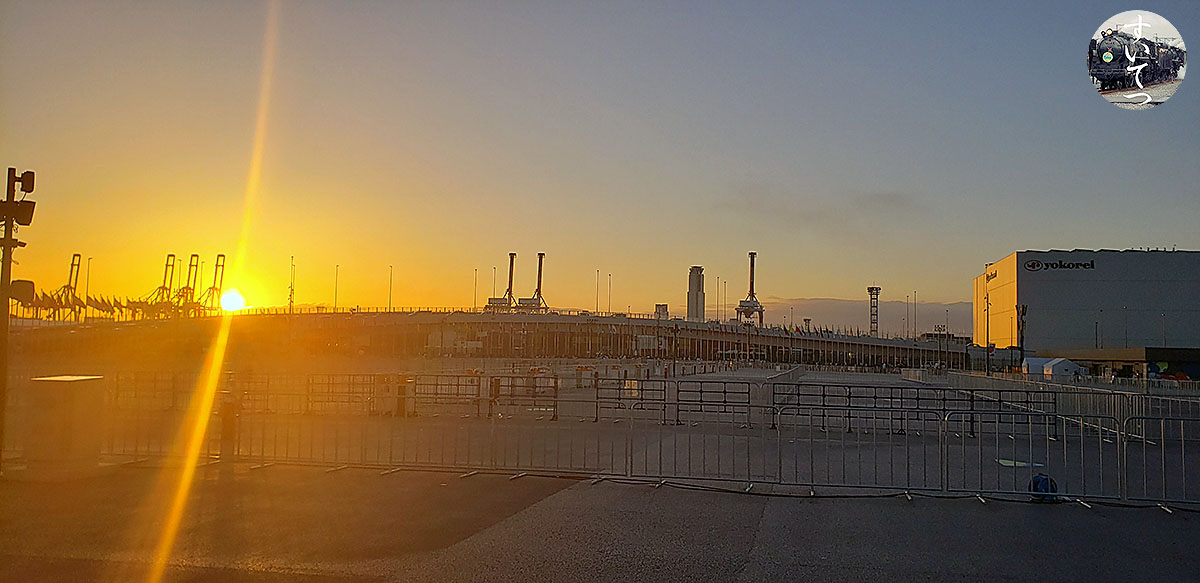 1時間チョイの睡眠を3回ほど取れた。まもなくゲート前広場が開門となるので一気に行列が伸びている。⇩位置にあるのが公衆便所を併設したコンビニ。右は一般道路なのでトラックやバイク(喧しい)の往来がある。 (4:33)